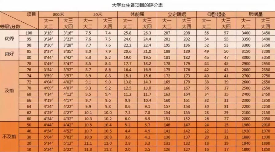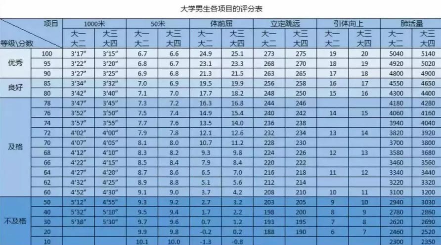 體測是大學生的一項基本檢測,大學期間至少需要有兩次體測成績達到50分或及其以上,方可通過畢業資格審核,以下是大學生體測項目及標準評分表,供大家參考,如與學校標準有差異,以學校為準: