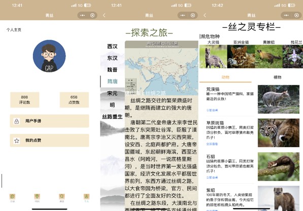 我們團隊共分為了三個小組,分別是代碼組,ui設計組,設計組。在開發過程中多采取小組討論的方式解決問題,更加高效迅速。本實踐采用了線上學習與線下調研結合的形式開展,團隊派遣同學分別前往北京、陜西、新疆、廣東等開展線下實踐,身臨其境地探索絲綢之路。這次此次實地考察,為團隊小程序開發提供了豐富的素材和靈感,也為用戶提供了更加豐富的內容 !除了線下實地考察外,我們團隊還創立了自己的公眾號,每周發表兩篇同步工作進展的高質量推送,以更好地宣揚絲路精神。