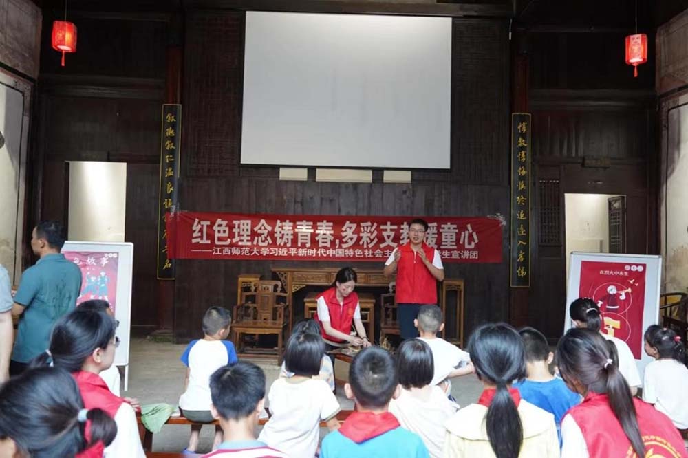 講述紅色歷史,組織支教課堂。在多次參觀紅色舊址后,宣講團團員們對紅色故事進行了整理匯總,希望將黨史故事說給更多人聽。在村支委的幫助下,宣講團于文獻坊開展了紅色支教課堂,整場教育以紅色故事為干,以編織草鞋為枝,以齊唱紅歌為葉,以兒童繪畫為果,繪就了江西師范大學宣講團成員與書樓村孩子們的青春畫卷。
