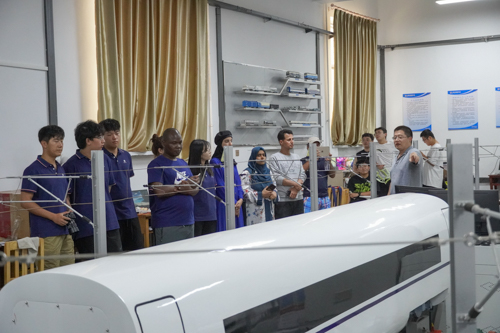 8月17日下午實踐團到訪石家莊鐵道大學。石家莊鐵道大學機械學院戚教授和劉教授帶領實踐團成員近距離觀看了正在研制的新一代高鐵模型與盾構機模型。戚教授運用流利的英語,生動而引人入勝地向實踐團成員介紹了高鐵的運行原理以及其在現代交通中的重要作用。高鐵技術的發展和應用是一個國家綜合實力的重要體現,留學生們驚嘆于中國高鐵在速度、安全方面取得的顯著成就和重大突破,中國學生為此也感到十分自豪。