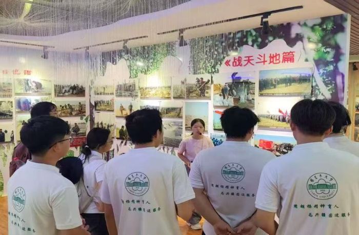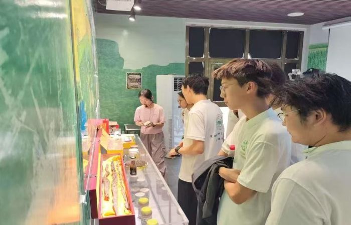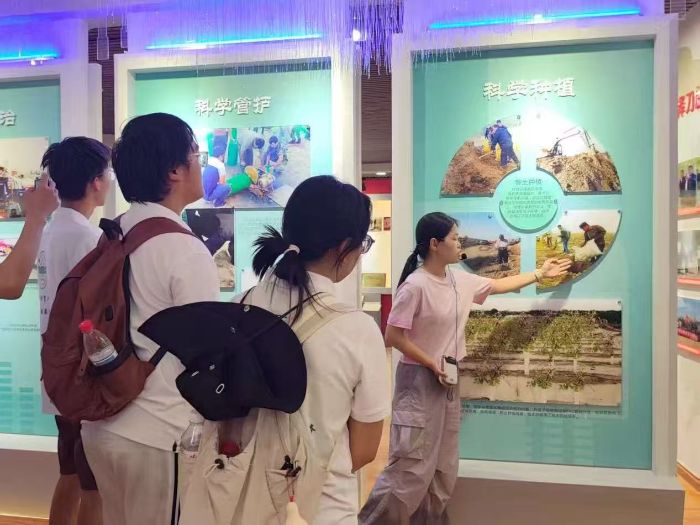 隨后,實踐團走進麥蓋提縣生態林展示館,在防沙治沙中心干部王姣姣的細致講解下,系統學習當地的治沙技術體系與產業發展模式。在“生態林鎖邊”“工程治沙”等展區,隊員們通過豐富的展板展示,深入了解到治沙人運用網格固沙、飛播造林、節水灌溉等科學手段,實現流沙固定、植被恢復的技術路徑,對治沙技術的不斷創新與發展表示由衷的贊嘆。在梭梭、肉蓯蓉等沙生植物培育區,實踐團成員們探究了沙生植物從適應沙漠環境的自然育種,經過人工選育、技術賦能,轉化為兼具生態固沙功能與經濟開發價值資源的全過程,深刻認識到科技在治沙工作中的重要作用。