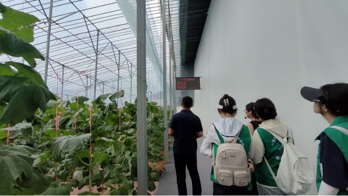 隨后,在講解員帶領下,我們走進11.7萬平方米的智能溫室,實踐團成員親身感受了科技帶來的變化:打藥一體機沿著滑軌穿梭在藤蔓間,既能精準噴藥又能噴淋降溫;水肥一體機通過手機終端即可設定參數,將養分直送作物根部;當棚內溫度超標時,系統自動報警并調節風口大小,全程無需人工干預。“現在滴灌系統的水資源利用率能達到95%以上,比傳統種植節省近一半成本。”技術員邊操作邊解釋。