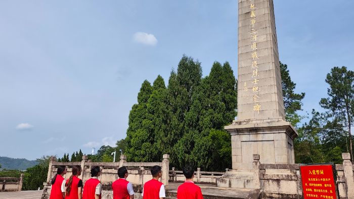為進(jìn)一步學(xué)習(xí)大埔紅色文化精神,團(tuán)隊(duì)來(lái)到三河壩戰(zhàn)役紀(jì)念館。隊(duì)員們圍站在戰(zhàn)役沙盤(pán)前,詳細(xì)了解1927年南昌起義部隊(duì)南下駐扎三河壩、掩護(hù)主力順利會(huì)師井岡山的壯闊歷史。看著墻上掛著起義軍在三河壩駐地留下的“誓死殺敵”的革命標(biāo)語(yǔ),隊(duì)員們無(wú)比崇敬,深切體會(huì)到了先烈們用血肉之軀守護(hù)革命火種的赤誠(chéng)與擔(dān)當(dāng)。隨著講解員的仔細(xì)解說(shuō),成員們拿起攝像設(shè)備對(duì)三河壩戰(zhàn)役紀(jì)念館八大展區(qū)進(jìn)行全流程拍攝,記錄了“浴血三河壩”動(dòng)態(tài)沙盤(pán)、朱德手稿等40余件核心展品,并將其制作成講解視頻和宣傳片。在八一起義軍三河壩戰(zhàn)役烈士紀(jì)念碑前,隊(duì)員們懷著崇敬之心駐足沉思,在講解員帶領(lǐng)下向革命烈士行三鞠躬禮,深切緬懷先烈的英勇壯舉。