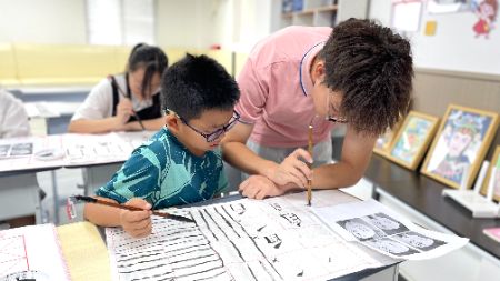 圖為志愿者在指導(dǎo)學(xué)生寫書法。李鍶怡攝