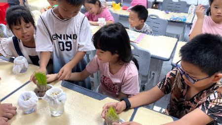 課堂上,隊(duì)員們先以生動的動畫演示植物根莖葉的功能,再帶領(lǐng)孩子們觸摸觀察各類植物標(biāo)本,讓抽象的知識變得可感可觸。隨后的實(shí)踐環(huán)節(jié)里,孩子們親手操作水培綠豆,栽種“會喝水的草頭娃娃”——這些頭頂能長出綠苗的迷你盆栽,成了孩子們的“勞動伙伴”。每天觀察生長變化、記錄生長日記、動手澆水修剪,孩子們在松土、灌溉的過程中,既掌握了植物生長的科學(xué)原理,又體會到勞動的價值與樂趣。“看著草頭娃娃‘長頭發(fā)’,就像看著自己種的希望在發(fā)芽。”一位三年級學(xué)生的話道出了大家的心聲。