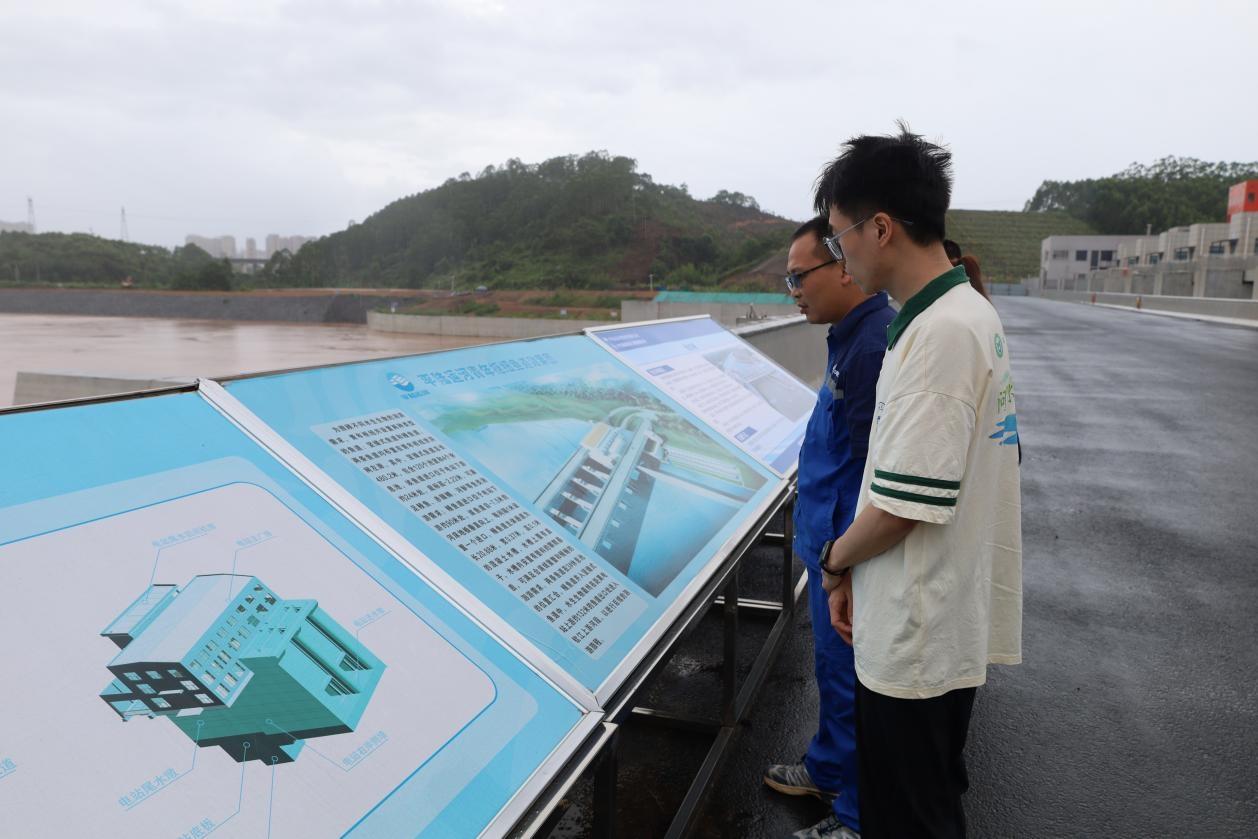 實踐團首先通過現場展板系統了解了國家高等級航道網布局規劃。平陸運河作為國家航道網“四縱”體系的重要組成部分,是推動西南地區對外開放的先導工程。“從規劃之初,‘生態優先’就貫穿始終。”工作人員介紹,青年樞紐在設計中融入了魚道建設、水土保持等生態措施,目前正同步推進主體工程與環境監測設施建設,為后續運行期生態管控奠定基礎。團隊成員認真記錄樞紐的工程規模、生態配套措施及當前建設進度,不僅為后續專業研討積累基礎信息,更對“重大工程與生態保護協同推進”有了直觀認知。