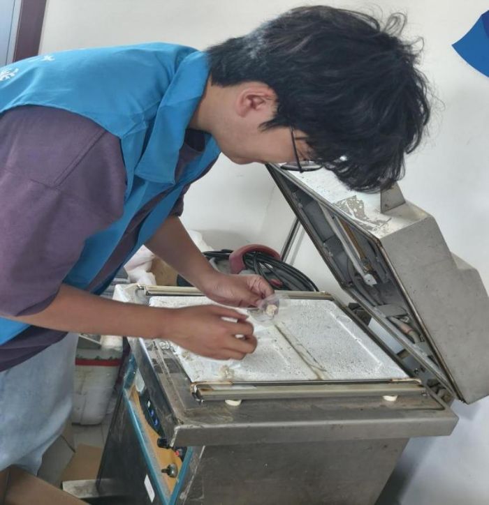 在介紹完爬寵食品的包裝之后,工作人員還向成員們展示了不同類型的運輸包裝容器,并講解了它們的優缺點。實踐團成員們親身體驗了凍干的包裝及真空壓縮的過程,了解了運輸包裝的特點以及模式。