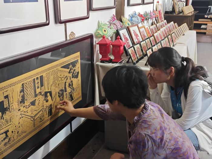 與非遺徽墨同樣聲名在外的,還有獨具匠心的徽州剪紙。在徽州古城仁和樓吳笑梅剪紙手工體驗館,實踐成員們在省級非物質文化遺產“徽州剪紙”代表性傳承人的指導下,上了一堂別開生面的非遺實踐課。