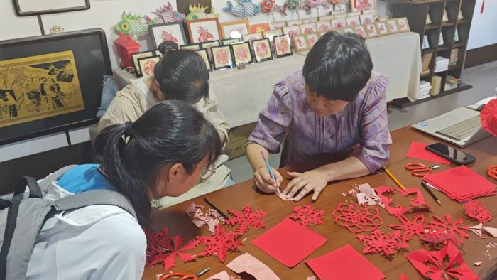 圖為非遺傳承人吳笑梅老師向實踐成員傳授剪紙技藝 胡陳宇 供圖