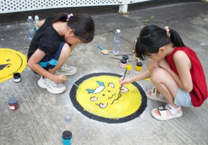 7月13日上午,藝新突擊隊結合前期調研(83%居民盼美化井蓋,74%家長期望兒童參與社區微更新),在城南社區祈安苑完成4處井蓋更新。團隊視傳專業同學設計金龍主題圖案,吸引眾多兒童參與創作,路過居民紛紛點贊。