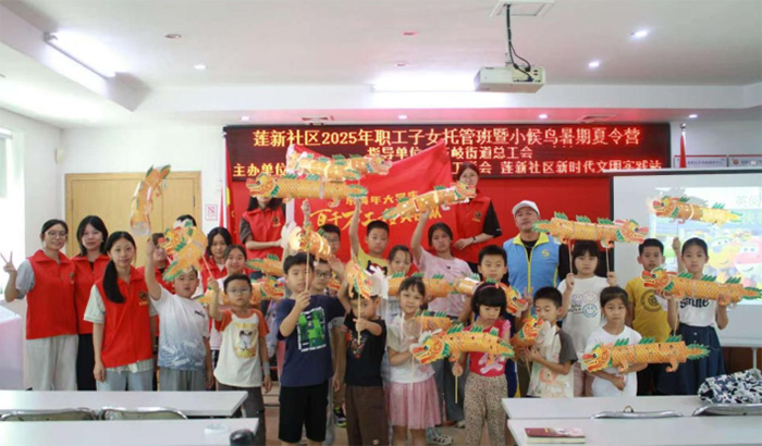 7月7日,藝新突擊隊結合前期調研結果(75%的兒童期待“英語 + 手工”融合課程),聯合非遺傳承人楊達華老師和felt團隊(電子科技大學中山學院外國語學院英語繪本教學團隊),在蓮新社區黨群服務中心舉辦非遺雙語親子夏令營,30余名兒童參與。