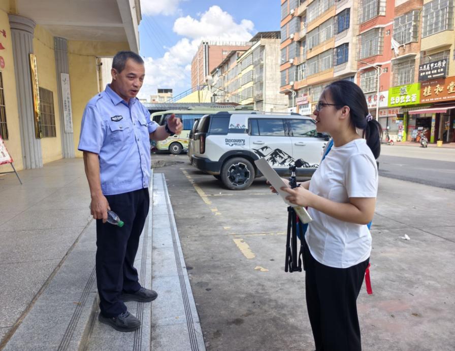在交流過程中,團隊成員也主動與一位在場的保安人員進行了溝通。這位保安人員表示自己知道“雖蕾”山歌。當了解到實踐團利用多模態數據庫等數字化手段來傳承山歌時,他表示認可這種方式,認為用新技術保存和傳播傳統文化是有效的。