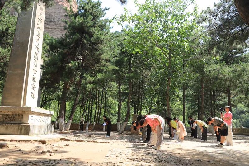 在黃崖洞紀念碑前,實踐團成員列隊肅立。當潔白的花朵輕放于烈士紀念塔下,材料工程專業學生宋學文在實踐筆記中寫道:“先輩們用‘土銼刀’淬煉大國利器的意志,藏著最動人的工匠密碼 —— 甄榮典那雙變形的手,在沒有精密儀器的年代,把每道銼痕都打磨得絲毫不差。”