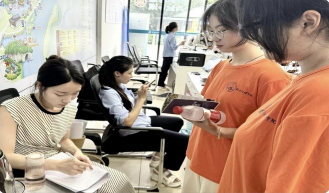 圖為實踐團隊隊員在桂林象山景區對正在休息的游客進行訪談。梁芯瑞 供圖
