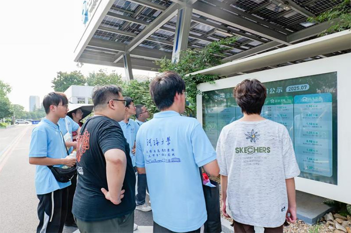 在電能俠充電基地,團隊成員實地考察了光伏建筑一體化技術的創新應用。通過專業講解與現場觀察,團隊深入了解了光伏發電系統與停車場結合的運作模式,及其在節能減排方面的實際成效。這使團隊成員對新能源產業鏈形成系統認知,同時拓寬了專業視野。