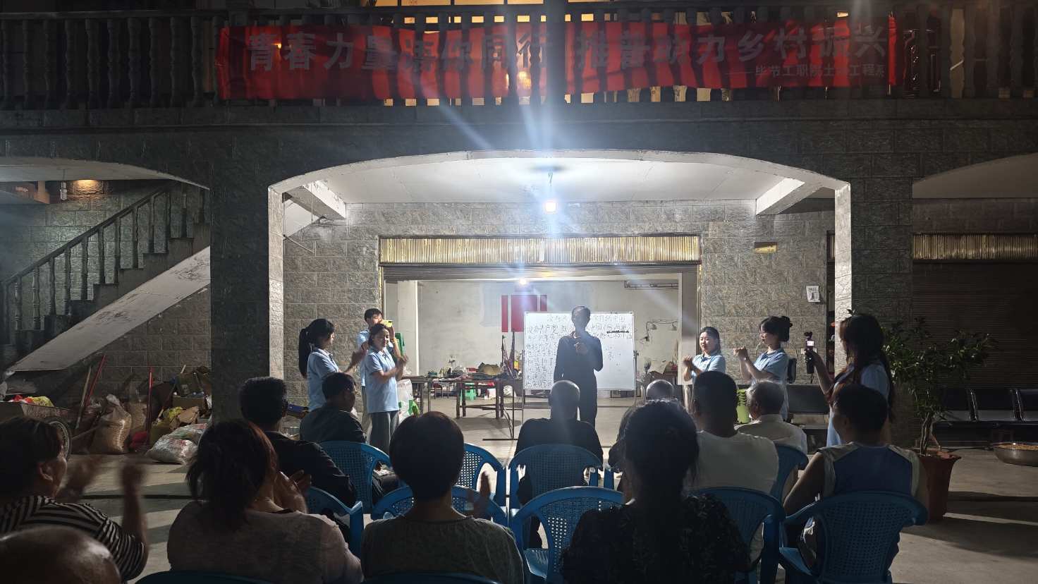 夜幕下,教學(xué)場地亮起溫暖的燈光,村民們身著日常服裝與身著藍(lán)色隊服的實踐隊隊員們圍坐成圈。前排幾位年長者專注地看著歌詞,實踐隊隊員們身著藍(lán)色隊服站在身后,所有人的目光都聚焦在臨時搭建的教學(xué)展板處。