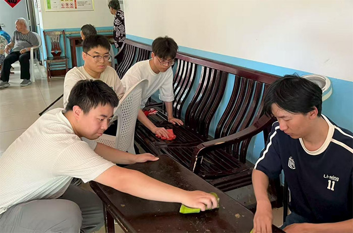 為了給老人們創(chuàng)造整潔舒適的環(huán)境,成員們還主動協(xié)助工作人員為老人擦桌椅。大家分工協(xié)作,有的認(rèn)真擦拭桌面,有的仔細(xì)清理桌腿,有的來回抹著椅子,各項(xiàng)活兒同時展開,動作麻利又細(xì)致,用汗水換來了桌椅的潔凈。