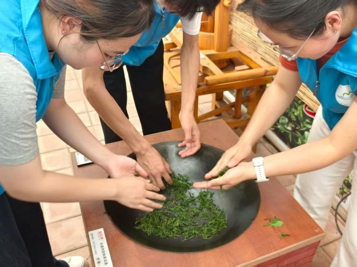 7月18日清晨,露水還凝在茶芽上,尹經(jīng)理已帶著我們走進(jìn)茶園。指尖掐住一芽一葉輕輕一提,嫩綠色的希望便落進(jìn)竹簍——這是我人生中第一次采茶,指腹沾染的茶香,比任何香水都更清冽。走進(jìn)制茶工坊,百年傳承的制茶工藝正在老師傅的手中流轉(zhuǎn)。攤晾臺(tái)上,鮮葉舒展著身軀,靜靜散發(fā)水汽;殺青鍋旁,高溫與茶葉碰撞出帶著草木香的白煙,師傅的手在鍋中靈活翻動(dòng),汗珠順著臉頰滑落,滴在青石板上洇出深色的印記;揉捻時(shí),茶葉在掌心漸漸成形,茶汁滲出的澀香里,藏著植物最本真的力量;最后一道干燥工序,將水分抽離的茶葉蜷縮成精巧的模樣,鎖住一整個(gè)春天的芬芳。尹經(jīng)理說(shuō):“這四步工序,少一步則香不醇,多一步則味過(guò)澀。”我們跟著學(xué)做綠茶時(shí),總在揉捻的力道上把握不準(zhǔn),老師傅便握著我們的手示范:“要像對(duì)待孩子似的,既要用力,又得心疼。”后來(lái)學(xué)做紅茶,看著茶葉在發(fā)酵中染上溫潤(rùn)的紅褐色,才懂得同一片葉子在不同工藝?yán)铮鼓芫`放出如此迥異的風(fēng)味。