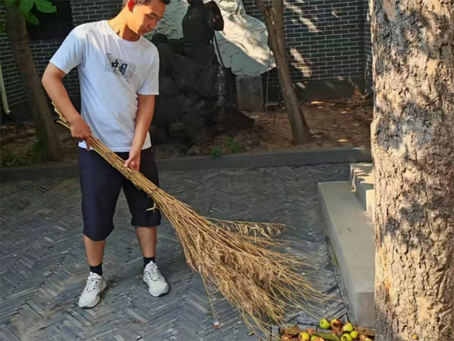 圖為實(shí)踐團(tuán)成員協(xié)助展館工作人員打掃院內(nèi)衛(wèi)生