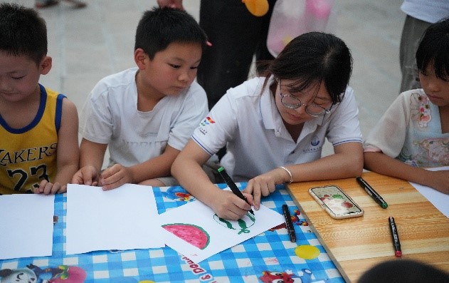 繪墻期間,團隊成員們了解到,很多鄉村的父母為了生計外出打工,導致許多小朋友缺少家長的陪伴,另外受限與鄉村教育的條件,孩子們也缺少藝術的學習與熏陶,因此團隊成員們發揮自身的專業優勢,通過美術活動來提升兒童的藝術審美,在駐村書記史立業的協助下搭建起了臨時的美術課堂,團隊成員為孩子們精心準備了豐富多彩的畫材,在專業的指導下,孩子們用手中的畫筆肆意揮灑著想象力與創造力。當畫筆在紙上流轉,一個個飽滿的西瓜,一串串鮮明的水果躍然紙上,汗水浸濕的衣衫,是孩子們亮晶晶的眼睛,而那些畫的格外出色的小小創作者,總能收獲一個扭扭氣球擰成的驚喜。通過將孩子們的作品展示在村落中,不僅美化了鄉村的環境,更激發了兒童和村民們對藝術的追求,對家鄉的熱愛和對美好生活的向往。