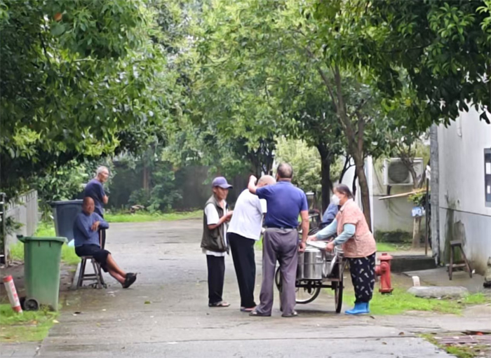 6月23日志愿者主動幫扶出行老人,在街道上,志愿者助力老人推行三輪車,細微之舉滿是關懷。