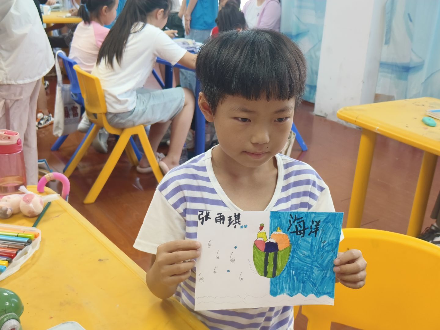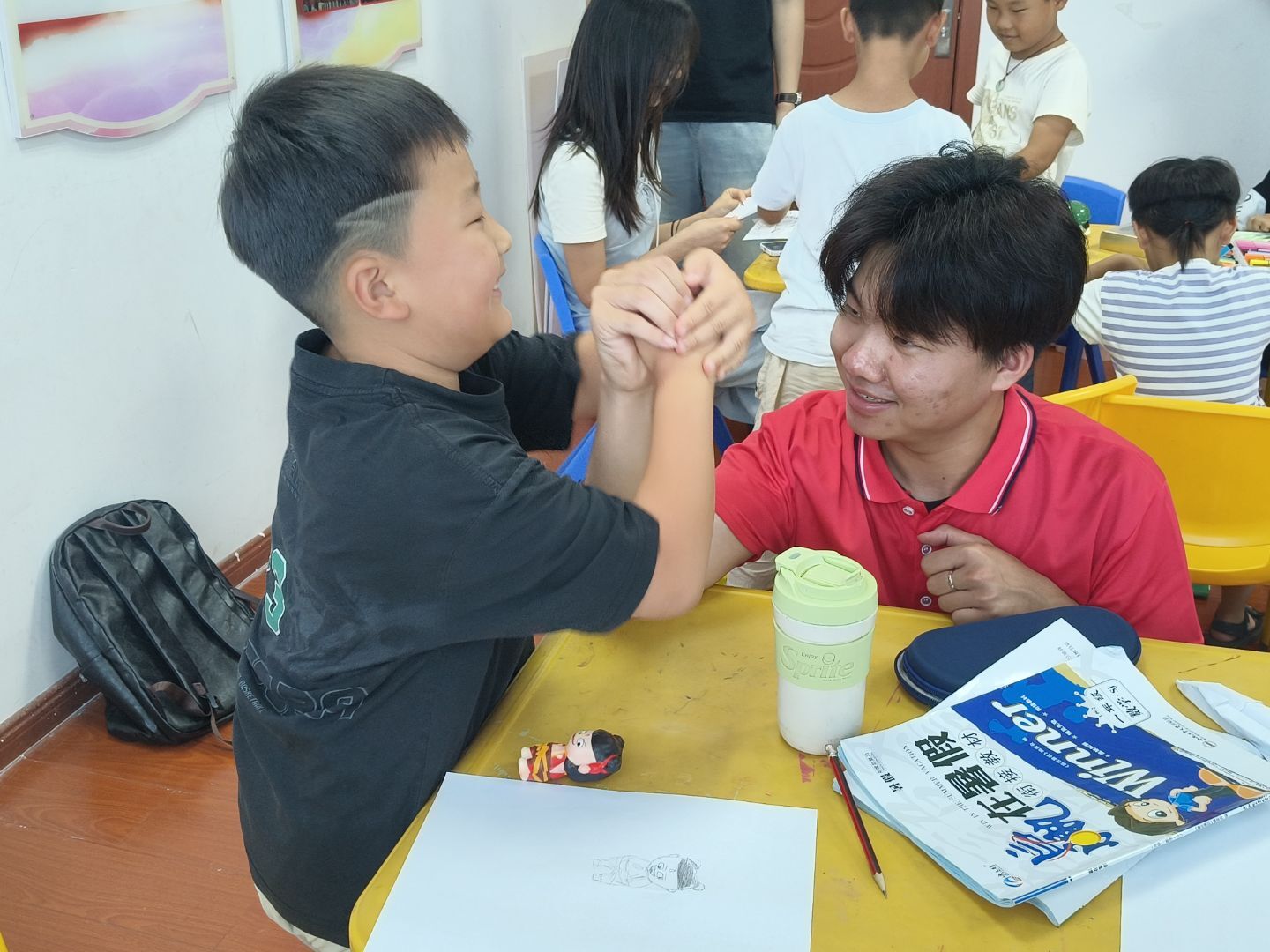 隨后,隊員們組織了繪畫活動。小孩子們迅速坐到座位上,迫不及待地拿起畫筆,開始在白色畫紙上揮灑色彩。