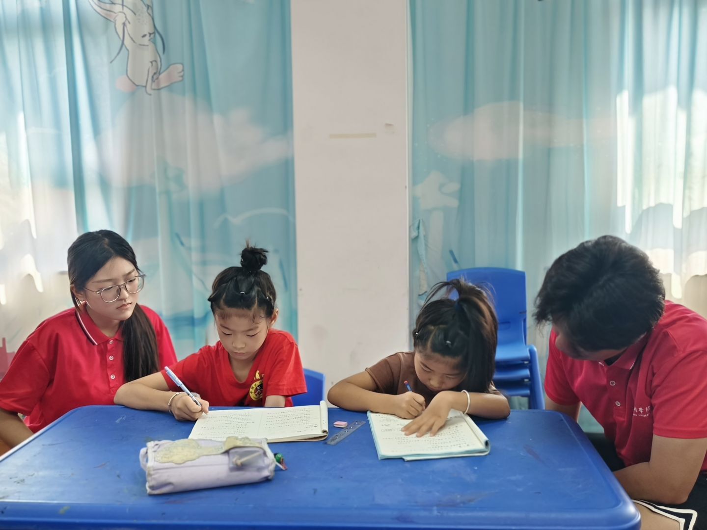 圖為隊員們輔導小孩子完成暑期作業的場景。劉丹 供圖