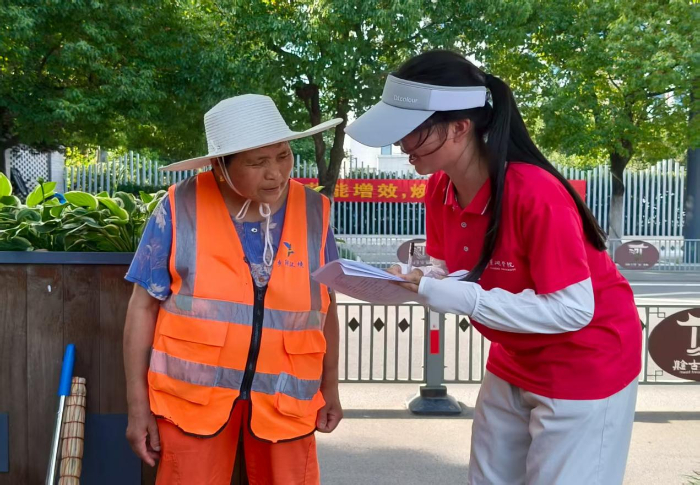 圖為實踐團成員為三河街頭環衛工人細致講解環保法實施情況問卷。姚玉嫻攝