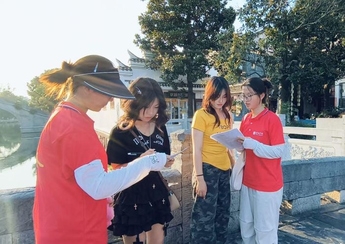 圖為實踐團成員對三河古鎮的部分游客進行與環保相關問題的訪談。牛雨婷攝