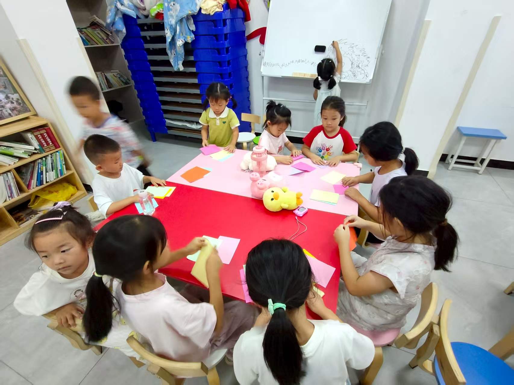 進入創作環節,志愿者為孩子們分發彩紙和尺子,鼓勵他們根據課件視頻,大膽動手操作。有的孩子內向不愛說話,卻愿意為了紙兔子舉手詢問志愿者,有的孩子活潑開朗,在自己強大的動手能力和積極互動中很快完成,志愿者穿梭在桌椅間,耐心給不知下一步如何的孩子指明道路,助力孩子們突破創作小瓶頸,讓每個孩子都能做出可愛的小兔子,在實踐中鍛煉動手能力與還能激發想象力、培養耐心與協作精神。