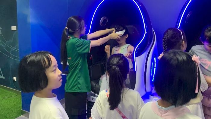 圖為“院長(zhǎng)媽媽有約”社會(huì)實(shí)踐科普隊(duì)員幫助小朋友體驗(yàn)?zāi)M天氣VR體驗(yàn)。潘依琳 供圖