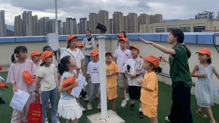 室外展示平臺上,氣象觀測儀器展示環節同樣精彩紛呈。科普隊員現場打開百葉箱并科普它的工作原理,講解其如何精準測量空氣溫度和濕度;日照計的刻度與光影變化被詳細解讀,讓孩子們明白日照時長的記錄方式;雨量筒前,隊員們進行倒水操作,通過實際測量理解降雨量的計量標準。親手操作的體驗讓孩子們對氣象觀測工作有了直觀認知,也感受到氣象數據背后的嚴謹與科學。