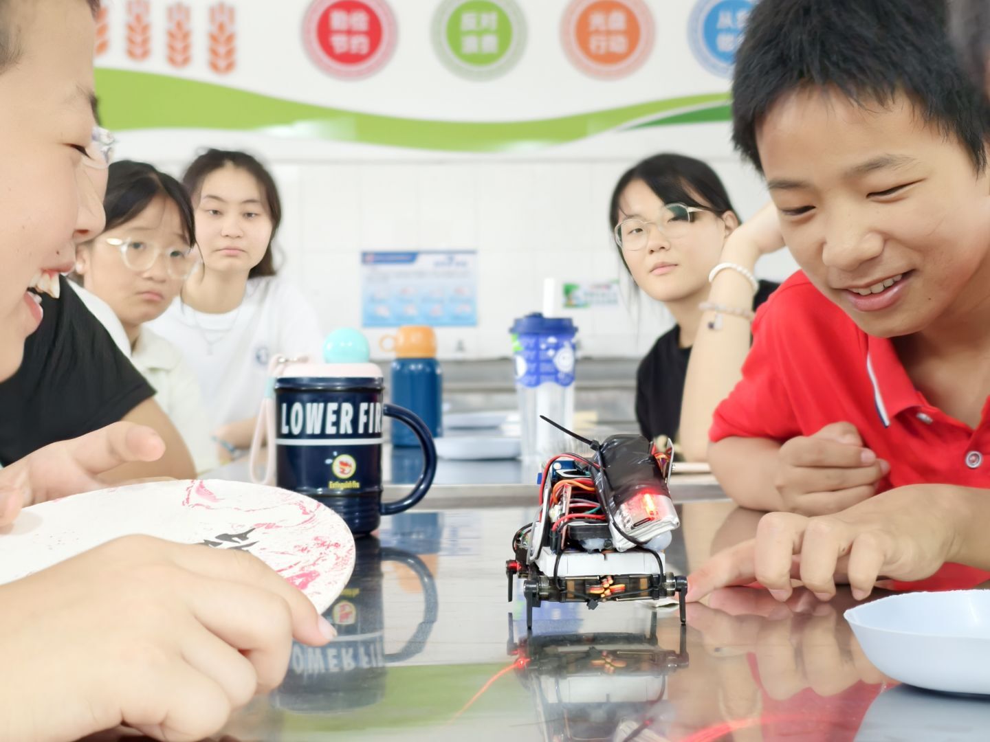 機(jī)器人課堂上,實(shí)踐隊(duì)員首先展示自制機(jī)器人“小智”,引導(dǎo)學(xué)生探索每個(gè)模塊的功能和作用,并耐心講解指令輸入順序和動作反饋原理。實(shí)踐隊(duì)員將機(jī)器人的功能與科研報(bào)國精神相結(jié)合,引導(dǎo)學(xué)生們思考機(jī)器人的運(yùn)用領(lǐng)域,幫助學(xué)生們在心中種下追逐科技夢想的種子。在激光實(shí)驗(yàn)和燃燒實(shí)驗(yàn)中,實(shí)踐隊(duì)員強(qiáng)調(diào)安全操作,講解光聚焦和火焰顏色變化的科學(xué)原理,引導(dǎo)學(xué)生記錄實(shí)驗(yàn)現(xiàn)象、分析實(shí)驗(yàn)結(jié)果。實(shí)踐隊(duì)員還會根據(jù)學(xué)生的觀察情況提出問題,啟發(fā)他們思考“為什么會產(chǎn)生這種變化”,并幫助他們用圖示和文字記錄實(shí)驗(yàn)數(shù)據(jù)。此次的科技課堂不僅讓學(xué)生掌握了基礎(chǔ)科學(xué)原理,還引導(dǎo)他們在操作、觀察、思考、總結(jié)的完整流程中建立了科學(xué)思維模式。