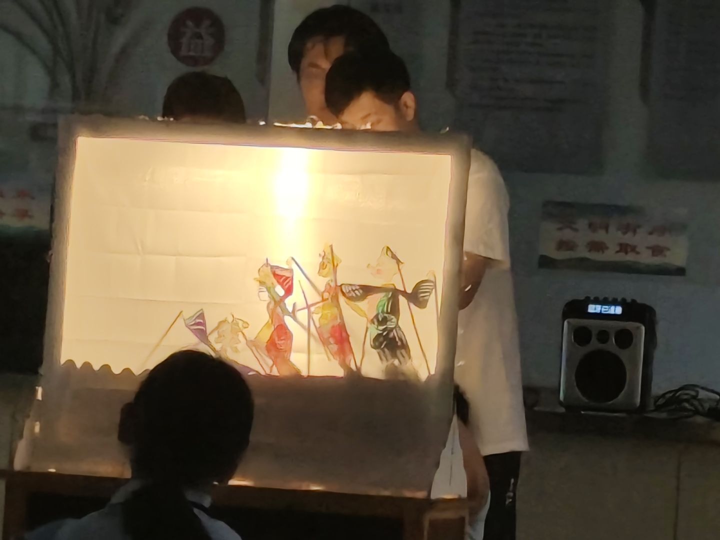 圖為實(shí)踐隊(duì)員和小朋友共同演繹皮影戲