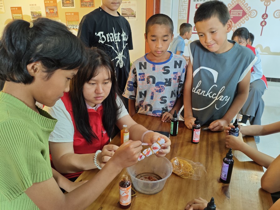 阿瓦提縣河濱社區的紅領巾小課堂內,白色方巾整齊疊放,靛藍、粉紫、鵝黃等染料錯落擺放,橡皮筋與手套靜靜等候——一場關于傳統扎染的非遺體驗之旅,正由塔里木大學“心若向陽 次第花開”伴童心同行志愿服務團悄然開啟。7月16日,志愿者們帶著這門古老的“絞纈”技藝走進課堂,為社區青少年打造了一場“指尖生花”的手工盛宴,讓傳統工藝的魅力在孩子們的巧手中綻放。