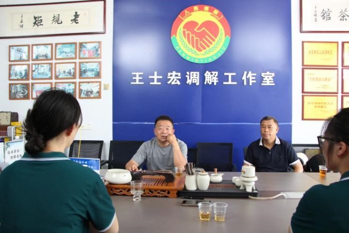 圖為“紅心潤(rùn)心團(tuán)隊(duì)”在王士宏調(diào)解工作室了解“一杯茶”調(diào)解法