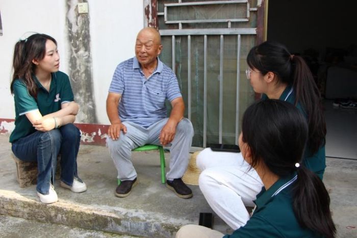 圖為“紅心潤(rùn)心團(tuán)隊(duì)”在和村聽(tīng)老支書(shū)講述“和村蘋(píng)果”的發(fā)展歷程