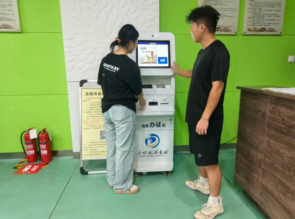 實踐團成員還給來閱覽室的人們講解如何使用自助辦證機,自助辦證機能幫大家快速辦理讀者證,有了它,不用排隊等候,自己操作就能完成證件辦理,之后就能更方便地使用閱覽室的電子資源和各類服務,省時又省力。