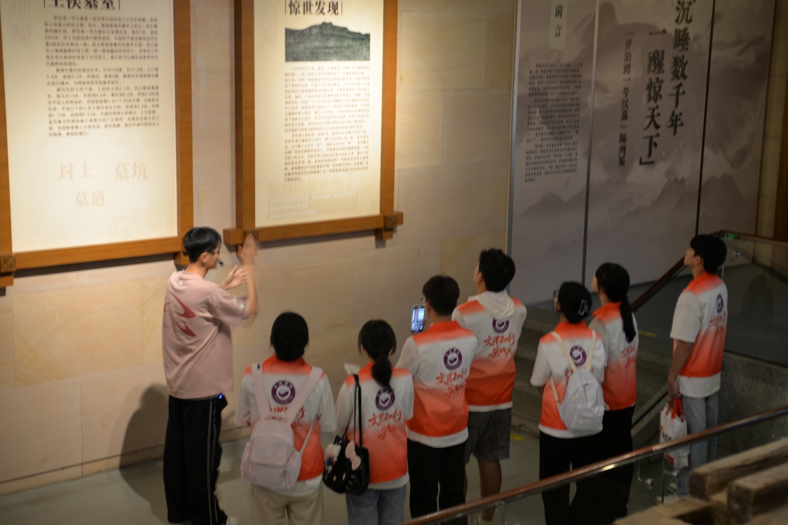 隨著講解員的細致解讀,成員們的目光緊緊追隨著文物與歷史的軌跡。“雙層槨室設計騙過了盜墓賊,第二層保存了7個殉葬人和一千多件文物”講解員說道。此時,實踐團成員心中無不驚嘆于古人的智慧:墓葬雖曾遭盜掘、主棺傾頹,盜墓者卻始終未能窺見地下暗藏的第二層槨室。正是這“藏巧于拙”的精妙設計,讓大批珍貴文物得以跨越兩千年時光,完整呈現在今人眼前。其中一件刻有“布”字的文物,更是與貴港古稱“布山縣”隔空呼應,為解碼地方歷史提供了不可多得的實物密鑰。