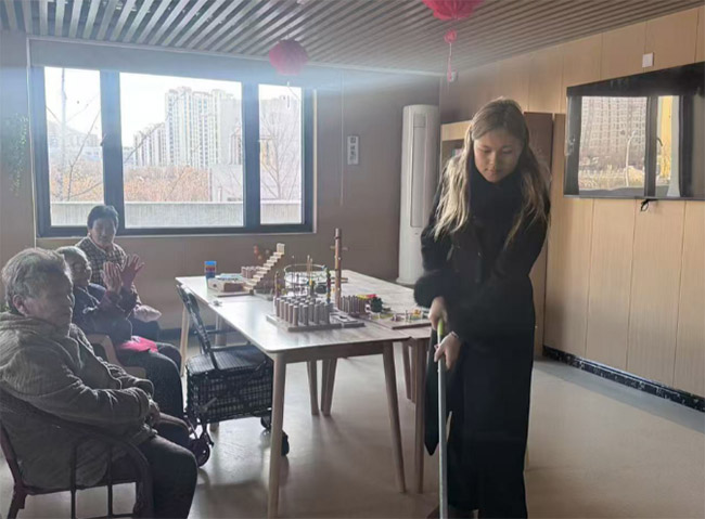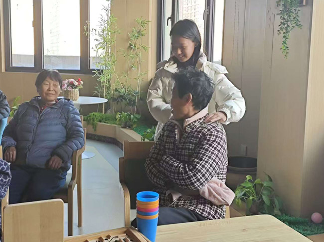 實踐團成員為老人按摩捶背,緩解他們身體的疲憊,傳遞貼心關懷。